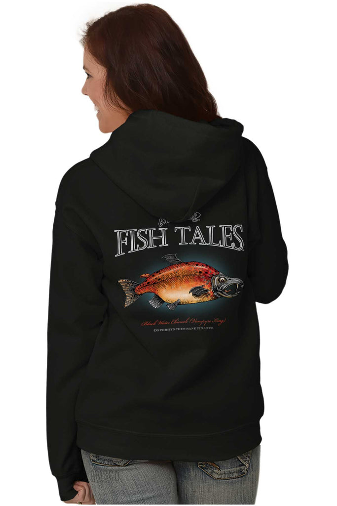 In 1933, while on the Columbia River to research fish ladders for the Grand Coulee Dam, Prof. McFinn heard legend of the "Great Bloodsuckers" that moved in a black cloud beneath it's waters. The tale of the Black Water Chinook sent shivers through the Native American tribes that fished the wild Columbia. This Zip Hoodie talks about just that. Enjoy the horror and craziness of the rare fish stories of old. This Zip Hoodie is for all of you who love fishing and scary stories altogether. If you love being outdoors then this is for you.