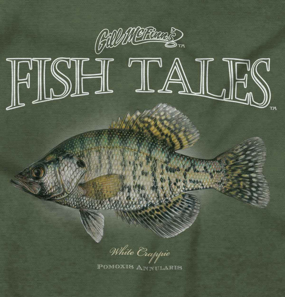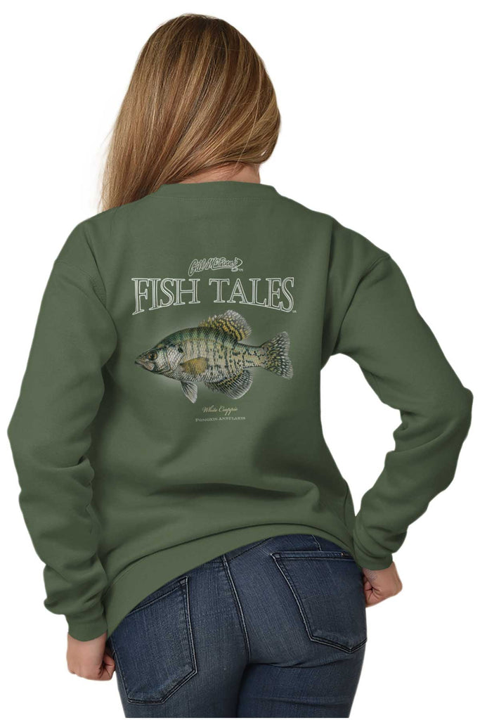 All throughout North America’s fresh waters systems, anglers are able to fish for these sunfish year round! The Central US states are the best bet to find both species of Crappie. This Crewneck Sweatshirt celebrates one of them: the White Crappie. Both Black and White Crappies are similar in their 8 inch length and less than a pound weight. It is their coloring that is the difference. White Crappies are a lighter silver fish with faint vertical bars on their sides and a dorsal fin with only 6 spines. Yet follow some advice: it don’t matter if their black or white!
