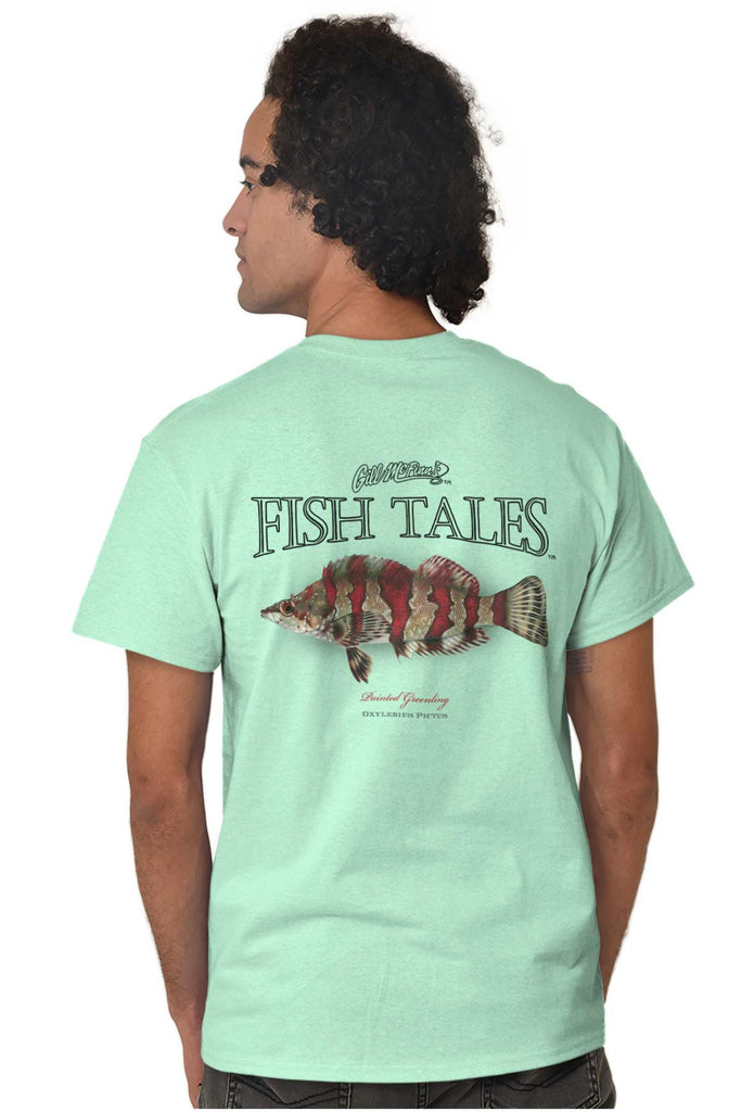 Along the Pacific coast, tide pools and rocky crags house a multitude of small aquatic species. None of them interest many anglers. There is no chance to hook one. But the Painted Greenling could become a catch for you with this T Shirt. The size of this bottom fish, averaging at just a few inches in length, might make it seem trivial. But this small grayish fish has a striking coloration pattern: rust bars that extend all the way onto its fins. Quite a beauty, but divers should beware. It likes to hover in the poisonous fish-eating anemones unaffected.